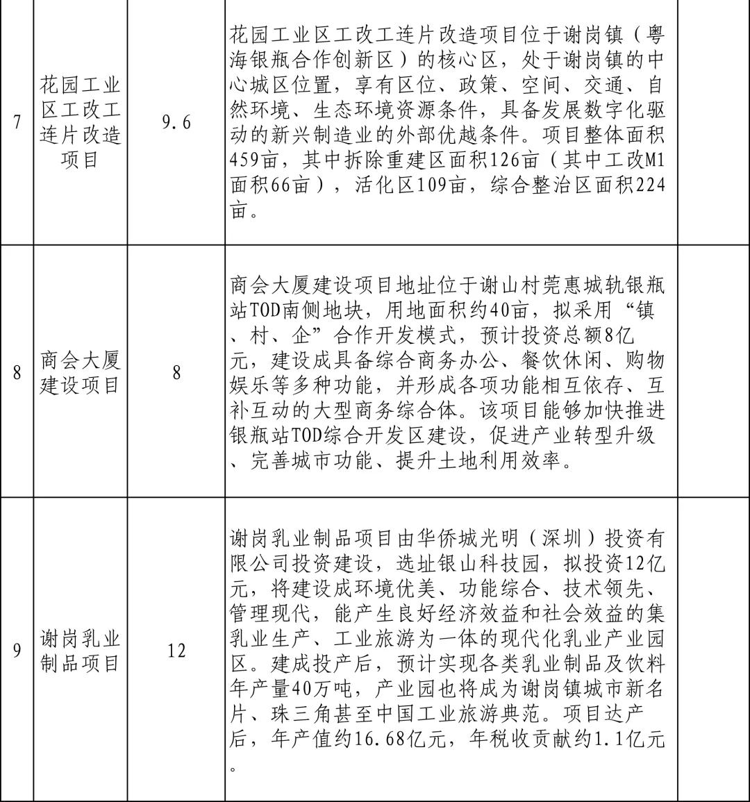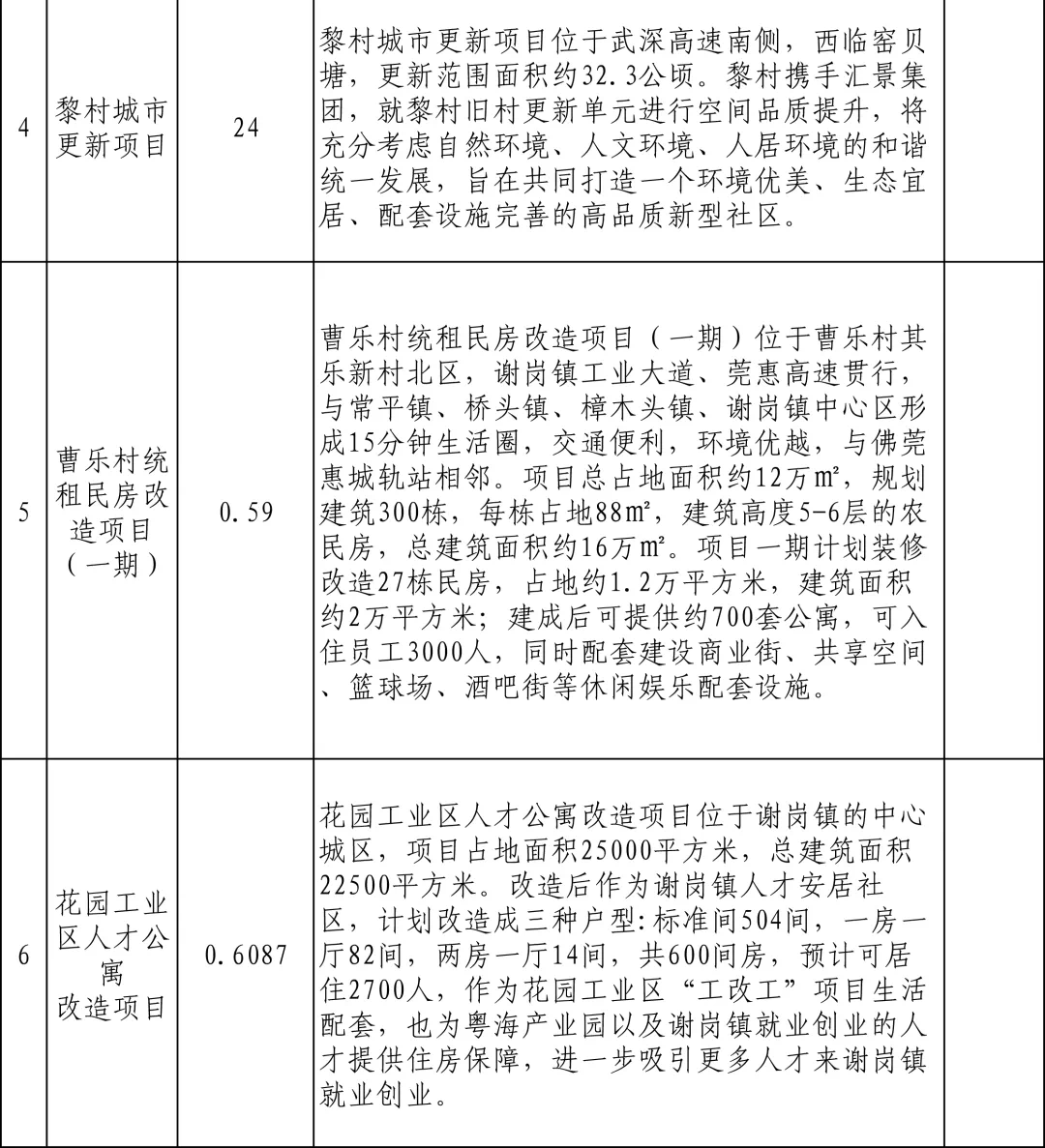 建成投产后,预计实现各类乳业制品及饮料年产量40万吨。目前,该项目正在申报市重大项目。此外,粤海产业园“筑巢引凤”取得突出成效,今年共招引6个项目,总投资额达20.2亿元。生活空间类签约项目共4个,总投资33亿元。其中,黎村城市更新项目总投资24亿元,更新面积约32.3公顷,根据市、镇两级的相关政策要求,黎村股份经济联合社将与汇景集团城市更新团队合作,就黎村旧村更新单元进行空间品质提升,共同打造一个环境优美、生态宜居、配套完善的高品质新型社区。