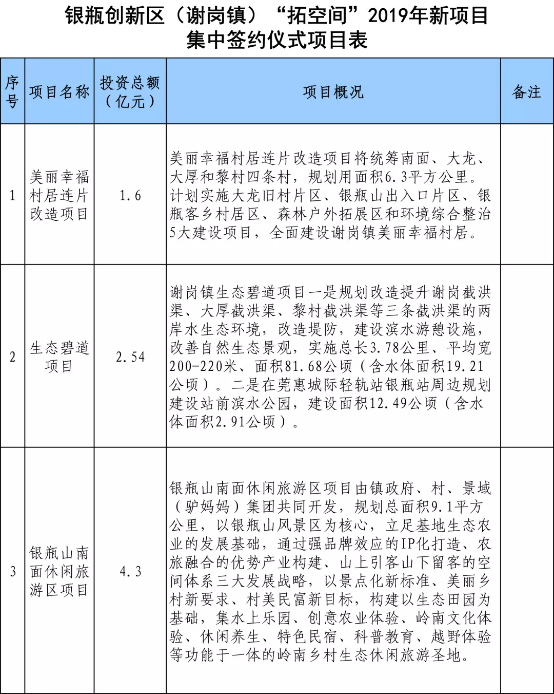 另外,还有总投资2.54亿元的谢岗镇生态碧道项目和总投资4.3亿元的银瓶山南面休闲旅游区项目。