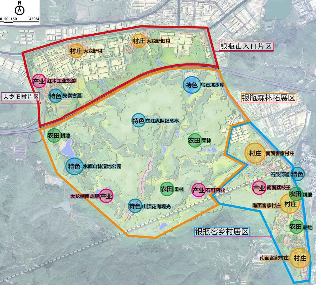 计划实施大龙旧村片区、银瓶山出入口片区、银瓶客乡村居区、森林户外拓展区和环境综合整治5大建设内容,共约35个分项目。