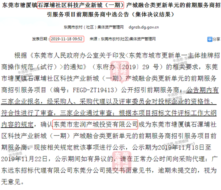 咱们接着来看石潭埔旧改,该项目属于“产城融合类”城市更新项目,确认由宏发作为前期服务商。