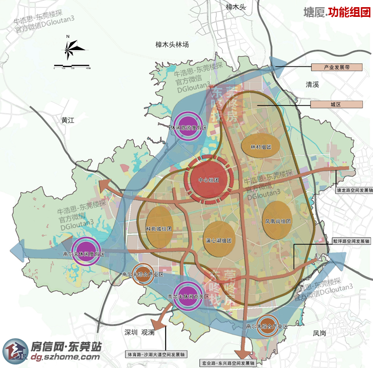 塘厦的功能组团分布比较明晰,中心组团是当之无愧的核心片区,林村+科苑城等组团也有各自的发展定位。