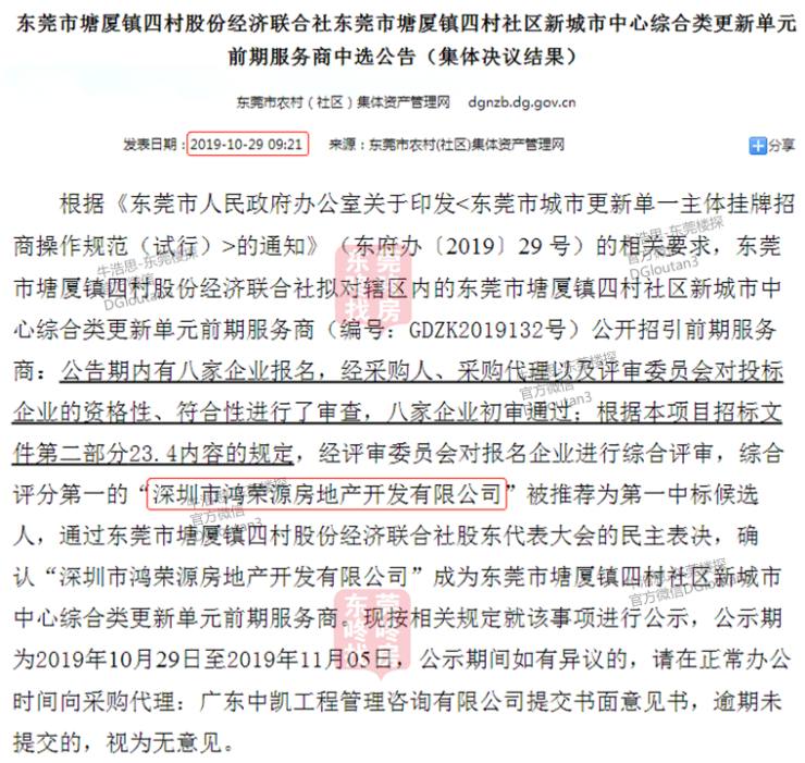 四村旧改具体是指四村社区新城市中心综合类更新单元,确认由鸿荣源作为前期服务商。