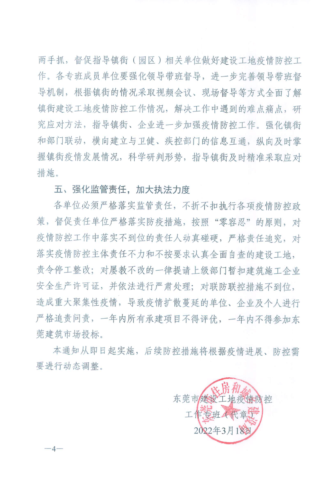 五、强化监管责任,加大执法力度各单位必须严格落实监管责任,不折不扣执行各项疫情防控政策,督促责任单位严格落实防疫措施,按照“零容忍”的原则,对疫情防控工作中落实不到位的责任人动真碰硬,严格责任追究,对落实疫情防控主体责任不力和不按要求认真全面自查的建设工地,责令停工整改;对屡教不改的一律提请上级部门暂扣建筑施工企业安全生产许可证,并依法进行严肃处理;对联防联控措施不到位,造成重大聚集性疫情,导致疫情扩散蔓延的单位、企业及个人进行严格追责问责,一年内所有承建项目不得评优,一年内不得参加东莞建筑市场投标。本通知从即日起实施,后续防控措施将根据疫情进展、防控需要进行动态调整。