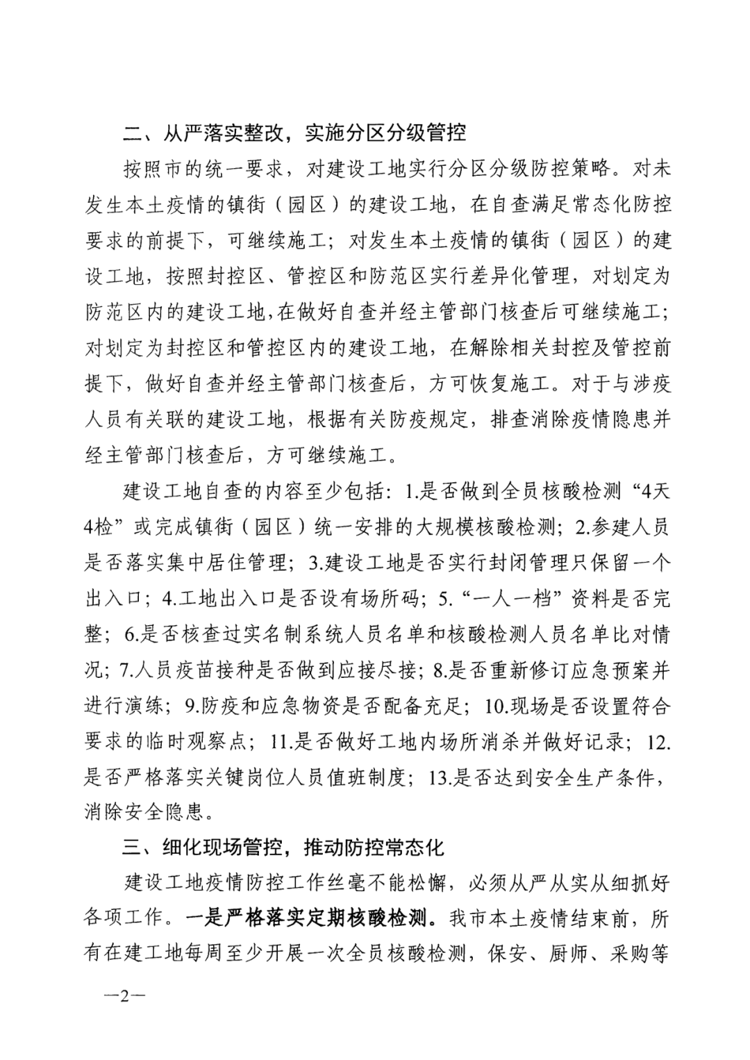 二、从严落实整改,实施分区分级管控按照市的统一要求,对建设工地实行分区分级防控策略。对未发生本土疫情的镇街(园区)的建设工地,在自查满足常态化防控要求的前提下,可继续施工;对发生本土疫情的镇街(园区)的建设工地,按照封控区、管控区和防范区实行差异化管理,对划定为防范区内的建设工地,在做好自查并经主管部门核查后可继续施工;对划定为封控区和管控区内的建设工地,在解除相关封控及管控前提下,做好自查并经主管部门核查后,方可恢复施工。对于与涉疫人员有关联的建设工地,根据有关防疫规定,排查消除疫情隐患并经主管部门核查后,方可继续施工。建设工地自查的内容至少包括:1.是否做到全员核酸检测“4天4检”或完成镇街(园区)统一安排的大规模核酸检测;2.参建人员是否落实集中居住管理;3.建设工地是否实行封闭管理只保留一个出入口;4.工地出入口是否设有场所码;5.“一人一档”资料是否完整;6.是否核查过实名制系统人员名单和核酸检测人员名单比对情况;7.人员疫苗接种是否做到应接尽接;8.是否重新修订应急预案并进行演练;9.防疫和应急物资是否配备充足;10.现场是否设置符合要求的临时观察点;11.是否做好工地内场所消杀并做好记录;12.是否严格落实关键岗位人员值班制度;13.是否达到安全生产条件,消除安全隐患。