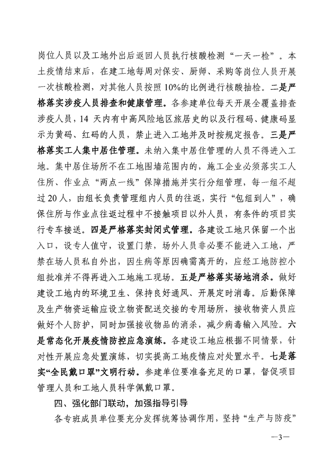 四、强化部门联动,加强指导引导各专班成员单位要充分发挥统筹协调作用,坚持“生产与防疫”两手抓,督促指导镇街(园区)相关单位做好建设工地疫情防控工作。各专班成员单位要强化领导带班督导,进一步完善领导带班督导机制,根据镇街的情况采取视频会议、现场督导等方式全面了解镇街建设工地疫情防控工作情况,解决工作中遇到的难点痛点,研究应对方法,指导镇街、企业进一步加强疫情防控工作。强化镇街和部门联动,横向建立与卫健、疾控部门的信息互通,纵向及时掌握镇街疫情发展情况,科学研判形势,指导镇街及时精准采取应对措施。