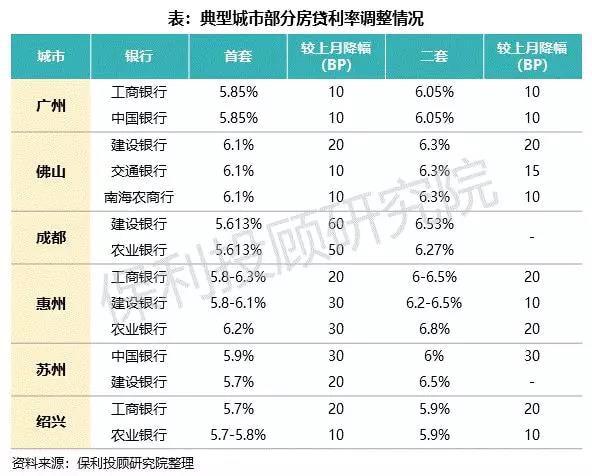 下调后,广州部分银行首套房贷利率5.85%,二套6.05%;佛山首套6.1%,二套6.3%;惠州首套也依然处于5.8-6.3%高位,二套6-6.8%。