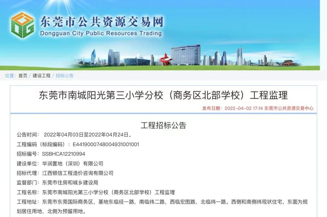 大家关注已久的 东莞CBD北部学校 有新消息了! 近日,市公共资源交易网发布了 东莞市南城阳光第三小学分校 (商务区北部学校) 工程监理招标公告 ↓↓ 公告显示 南城阳光第三小学分校 位于东莞CBD商务区 基地东临经一路,南临纬二路 西临宏图路,北临纬一路 西侧和南侧为现状住宅 东面为规划居住用地,
