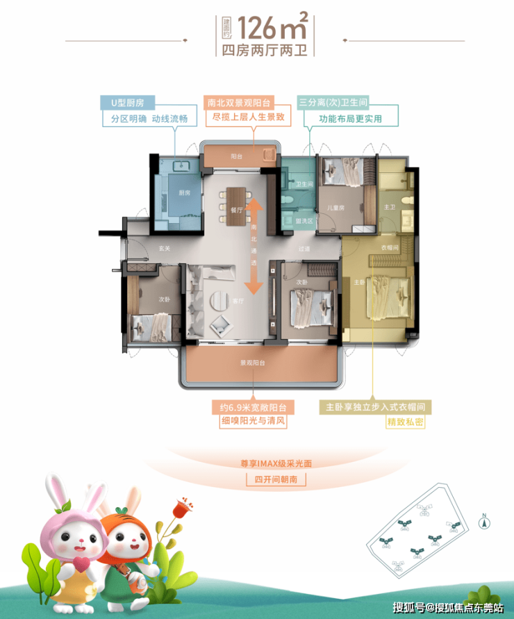 126㎡----四开间朝南,南北对流双阳台的设计,通风采光良好。约6.9米横阔主阳台连通次卧,最大程度延伸了空间的尺度感。主卧套间可以作为带有独立衣帽间;公私卫生间均带有窗台,提升使用便利度。