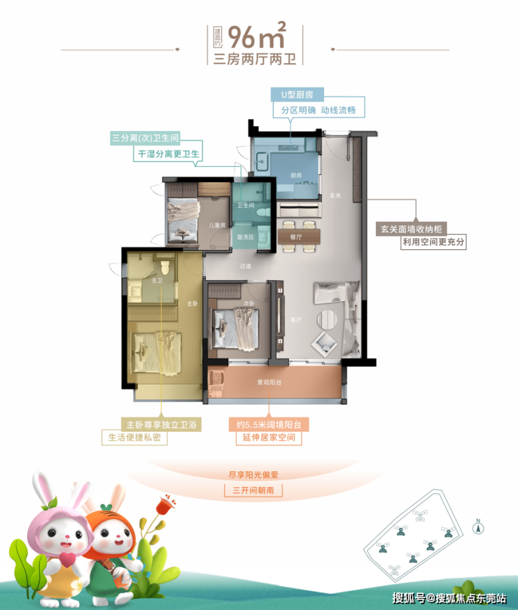 96㎡----建面约96㎡的三房,拥有约5.5米的阔绰阳台,超大开间,同时还有约22㎡的大主卧空间,该户型实用率高,多飘窗、长收纳玄关、双跨阳台、主卧独立套间等配置,南北通透、动静分离,符合刚需客群需求。