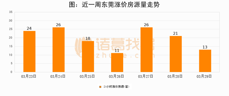 根据诸葛找房数据显示,东莞24小时涨价房源量为13套,较03月28日减少8套,环比下降38.1%。与此同时,涨价房源占比小幅回落,对于购房者来说是一个入市窗口期,购房者可抓住时机入市。