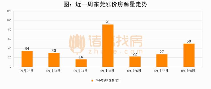 根据诸葛找房数据显示,东莞24小时涨价房源量为50套,较09月27日增加23套,环比上涨85.2%。与此同时,涨价房源占比小幅扩大,业主信心有所提升。