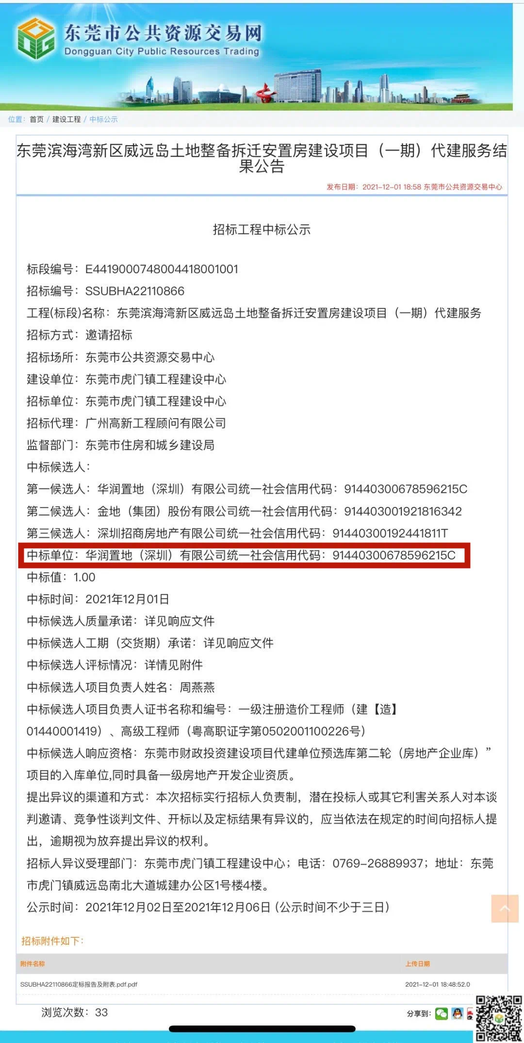 据了解,这次中标的华润置地(深圳)有限公司是世界500强企业,拥有国家房地产开发企业一级资质,尤其在深圳成功开发了华润城(大冲村旧改项目)。