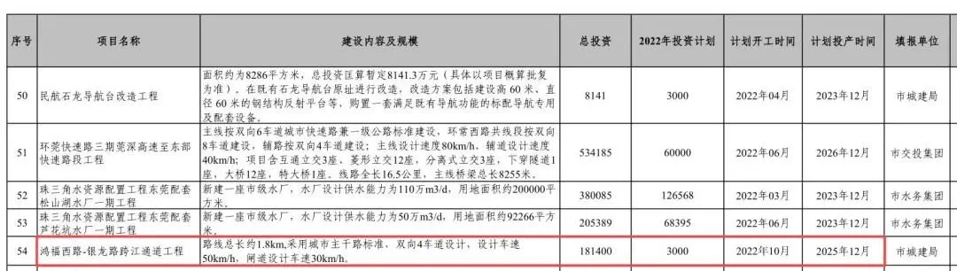 另外,鸿福西路-银龙路跨江通道被纳入2022年东莞市重大项目清单,将于2022年10月开工,2025年12月建成。