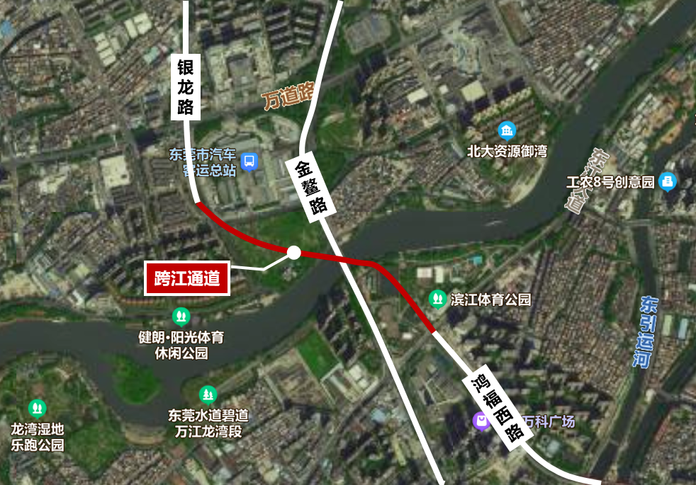 据东莞市公共资源交易网发布的公告显示,鸿福西路-银龙路跨江通道是一条北起万江大道,沿银龙路向南穿越东莞水道和曲海大桥,向南接鸿福西路,南至港口大道,是一条串联南城-万江的重要跨江通道。