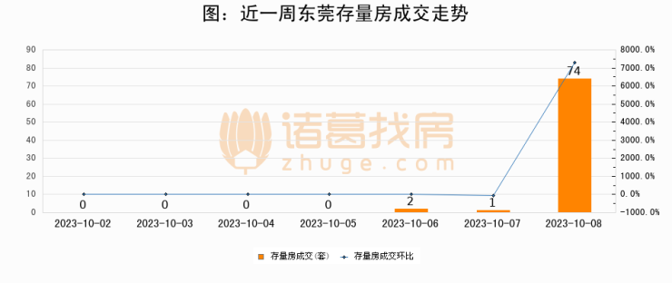 从存量房来看,2023年10月08日东莞存量房单日成交74套,比昨日增加73套,环比上涨7300%。从近一周存量房成交来看,东莞存量房日均成交套数为11套,10月08日单日成交74套,高于近一周平均水平572.7%。