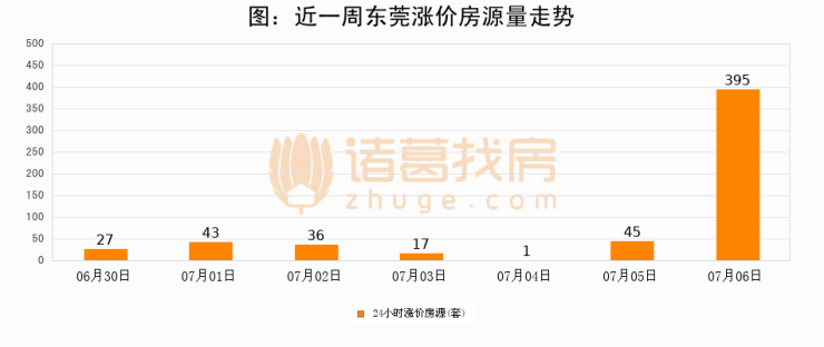 根据诸葛找房数据显示,东莞24小时涨价房源量为395套,较07月05日增加350套,环比上涨777.8%。与此同时,涨价房源占比小幅扩大,业主信心有所提升。