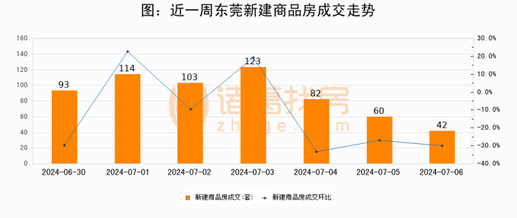 根据东莞市住房和城乡建设局数据显示,2024年07月06日东莞新建商品房成交42套,较昨日减少18套,环比下降30%