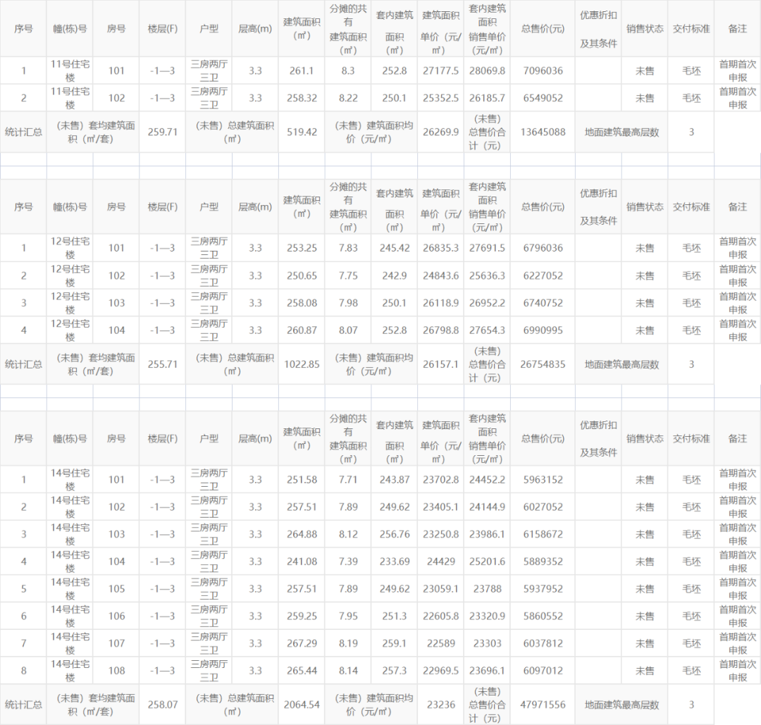 在别墅方面,此次项目一共备案14套别墅,建筑面积在241-267㎡之间,毛坯单价在22589-27178元/㎡之间,别墅总价约586-710万元/套。