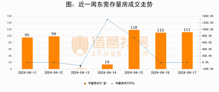 从存量房来看,2024年04月17日东莞存量房单日成交111套,比昨日增加1套,环比上涨0.9%。从近一周存量房成交来看,东莞存量房日均成交套数为78套,04月17日单日成交111套,高于近一周平均水平42.3%。