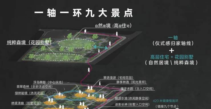 一轴一环九景:将江景搬到社区,在水上造一片绿洲,以山水的境界,释放胸襟彰显品位。一轴一环九景园林设计,打造六重仪式感的归家动线,420米健康慢跑环,链接社区九大景点!