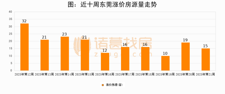从调价房源来看,第21周东莞涨价房源15套,较上周下降21.1%。与此同时,21周涨价房源占比回落6.41个百分点,业主信心小幅波动,购房者可则需入市。