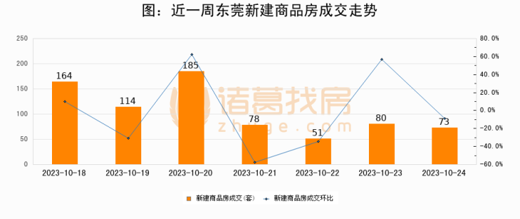 根据东莞市住房和城乡建设局数据显示,2023年10月24日东莞新建商品房成交73套,较昨日减少7套,环比下降8.8%