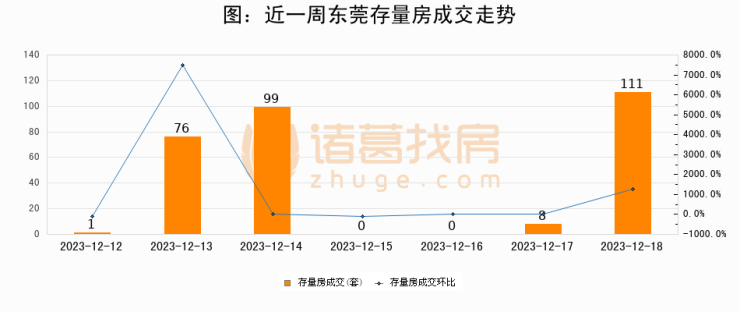 从存量房来看,2023年12月18日东莞存量房单日成交111套,比昨日增加103套,环比上涨1287.5%。从近一周存量房成交来看,东莞存量房日均成交套数为42套,12月18日单日成交111套,高于近一周平均水平164.3%。