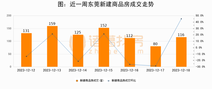 根据东莞市住房和城乡建设局数据显示,2023年12月18日东莞新建商品房成交116套,较昨日增加36套,环比上涨45%