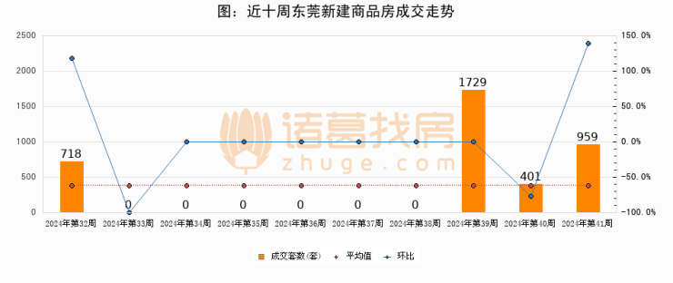 进入2024年第41周(10月07日-10月13日),东莞新建商品房成交959套,较上周增加558套,环比上涨139.2%