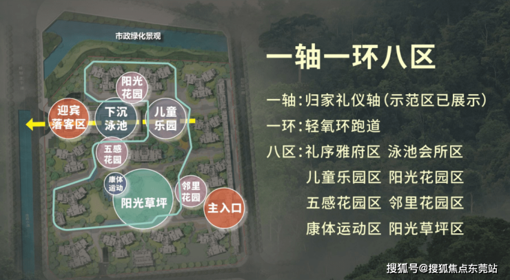 项目外部双面环水,玉带环腰,顺风顺水,内部建筑围合方式围绕园林的空间规划理念,重金打造“一轴一环八区”三大体系的3.9万㎡都市森邻主题园林。