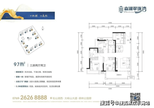 97㎡三房户型:享受超大阳台,格局方正,餐客一体,空间尺度宜居舒适;118㎡、142㎡四房户型:南北通透,超大阳台四开间朝南,享受大岭山森林公园与中心园林的双重景观资源。127㎡四房户型:五开间朝南,阳台面宽约9米,阳光可在家里肆意挥洒。另外,还有片区稀缺189㎡的塔尖大平层产品,10米宽幕阳台享无敌风景,五开间朝南,主卧配套270°飘窗。