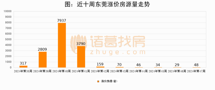 从调价房源来看,第47周东莞涨价房源48套,较上周上涨65.5%。与此同时,47周涨价房源占比提升6.28个百分点,业主信心持续恢复。