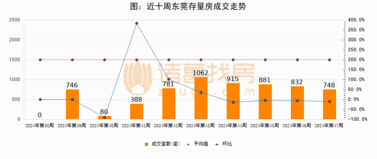 存量房方面,第47周东莞存量房成交748套,较上周减少84套,环比下降10.1%。从近十周成交走势来看,周均成交套数为643套,本周高于平均水平16.3%。