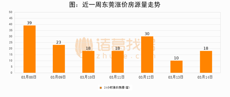 根据诸葛找房数据显示,东莞24小时涨价房源量为18套,较03月13日增加8套,环比上涨80%。与此同时,涨价房源占比小幅扩大,业主信心有所提升。