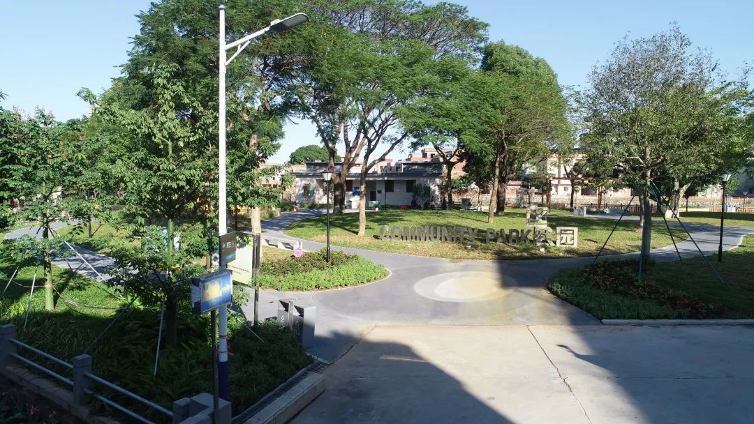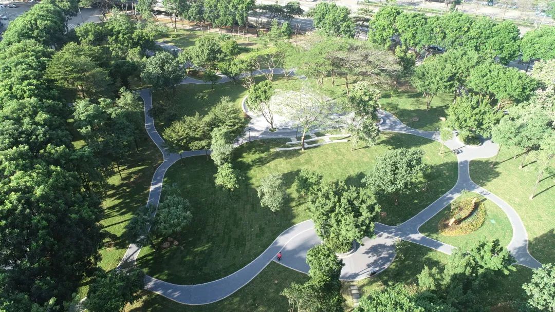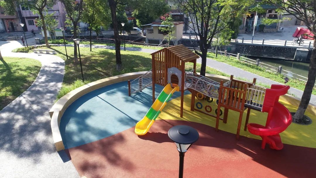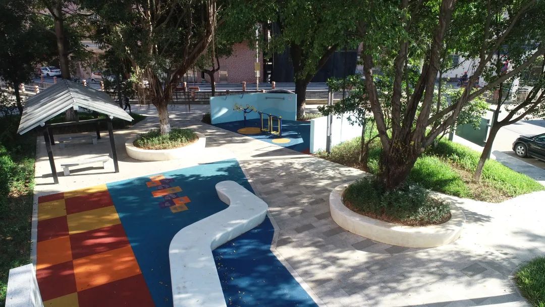 位于流涌尾社区胡氏宗祠旁,绿化面积约4000平方米。通过拆除原有老旧建筑及道路,重新铺设园路,种植绿化、增加有色彩的植物,增设滑梯、景观坐凳、休闲廊架等娱乐设施,从而完善公园游乐、运动等相关的功能,改善人居环境。