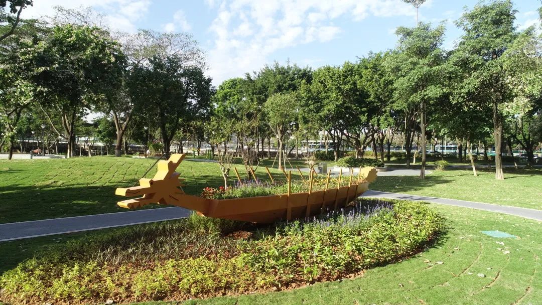 总面积约8500㎡,绿化面积约为6300平方米,其中绿化改造面积约3050平方米。该公园主要是利用原有较为宽敞的临近硬地空间,做好空间衔接与整合,形成集中的活动休闲场地,另外疏理绿化、增加色彩,并融入万江特色文化龙舟元素,打造成一个服务周围商业、居民区域的休闲娱乐空间。
