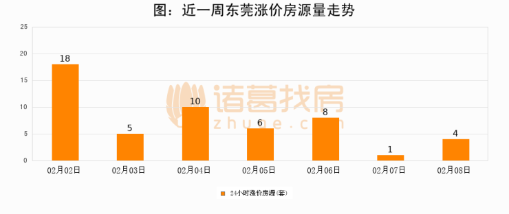 根据诸葛找房数据显示,东莞24小时涨价房源量为4套,较02月07日增加3套,环比上涨300%。与此同时,涨价房源占比小幅扩大,业主信心有所提升。