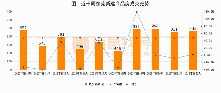 进入2023年第52周(12月18日-12月24日),东莞新建商品房成交933套,较上周增加22套,环比上涨2.4%
