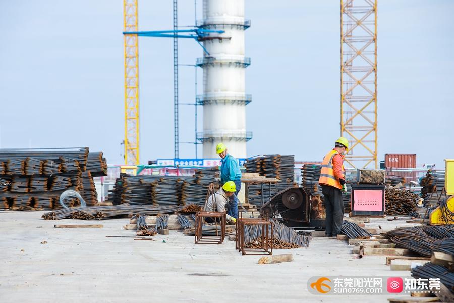施工现场钢筋材料整齐堆放,电钻声、机器轰鸣声此起彼伏。施工人员正在加紧进行主塔焊接、现浇梁施工和引桥附属结构施工。