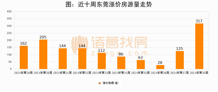 从调价房源来看,第38周东莞涨价房源317套,较上周上涨153.6%。与此同时,38周涨价房源占比提升1.06个百分点,业主信心持续恢复。