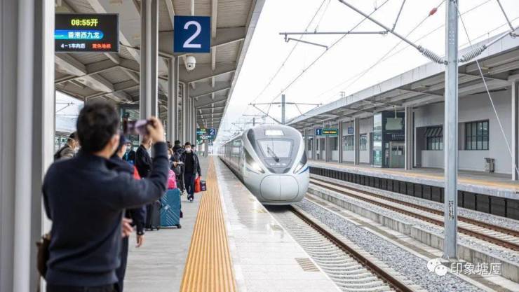 2023年1月15日8时47分,从香港西九龙出发的G6552次动车组列车,经过46分钟运行,经停福田站、深圳北站后,平稳驶入位于塘厦镇的东莞南站,成为赣深高铁开通运营后第一班从香港抵达塘厦的高速动车组列车。