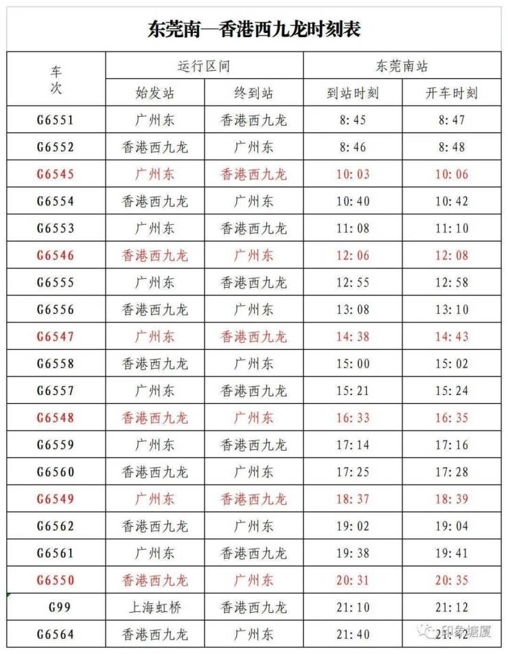 7月1日起,途经东莞南站前往香港西九龙的高速动车组车次信息,具体以12306官网为准。