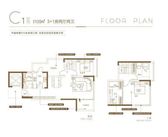全南向设计,墅区里洋房:建面约81-125㎡聆江高层 ,约0.24窗地比,“坪庭”景观阳台。 建面约143-195㎡滨江城墅