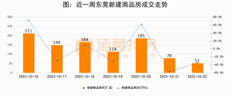 根据东莞市住房和城乡建设局数据显示,2023年10月22日东莞新建商品房成交51套,较昨日减少27套,环比下降34.6%