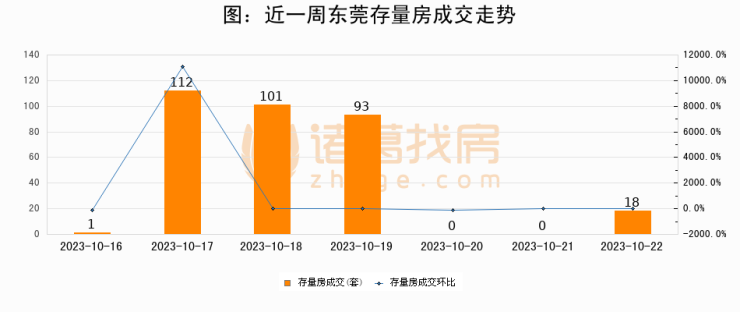 从存量房来看,2023年10月22日东莞存量房单日成交18套,比昨日增加18套,环比上涨0%。从近一周存量房成交来看,东莞存量房日均成交套数为46套,10月22日单日成交18套,低于近一周平均水平60.9%。