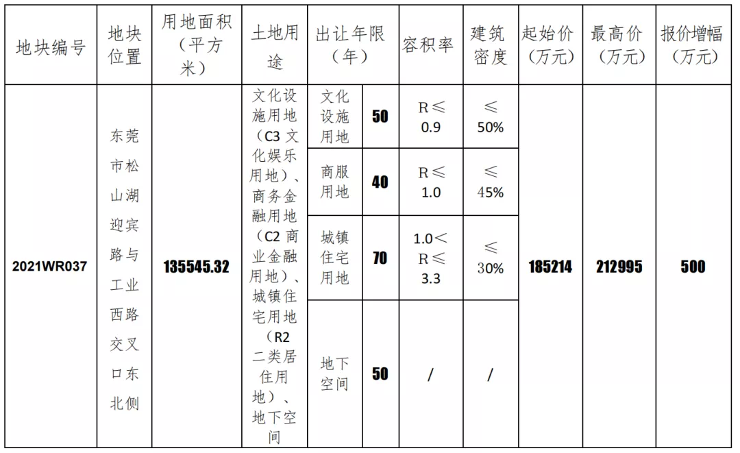 2、竞得人须在地块①无偿配建计容建筑面积不少于30000㎡的展演中心,配建造价不低于54555万元,土地竞得主体需运营展演中心15年(具体以管委会和竞得主体签订的相关协议为准),建成验收后需无偿移交给东莞松山湖高新技术产业开发区管理委员会(或其指定单位)接收(由东莞松山湖高新技术产业开发区管理委员会监管)。