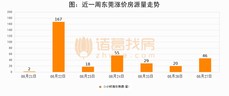根据诸葛找房数据显示,东莞24小时涨价房源量为46套,较08月26日增加26套,环比上涨130%。与此同时,涨价房源占比小幅扩大,业主信心有所提升。