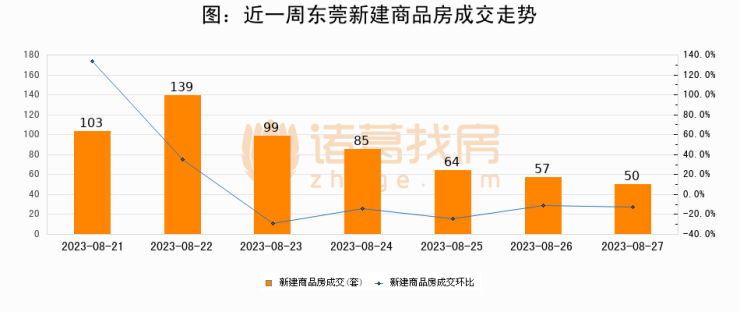 根据东莞市住房和城乡建设局数据显示,2023年08月27日东莞新建商品房成交50套,较昨日减少7套,环比下降12.3%