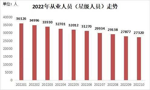 从深房中协统计数据走势看更为清晰。2022年前10个月,深圳房地产中介行业实名登记从业人员呈“净流出”状态,从2022年1月的36126人下降至2022年10月的27320人。