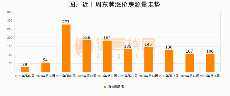 从调价房源来看,第15周东莞涨价房源106套,较上周下降0.9%。与此同时,15周涨价房源占比提升0.48个百分点,业主信心持续恢复。